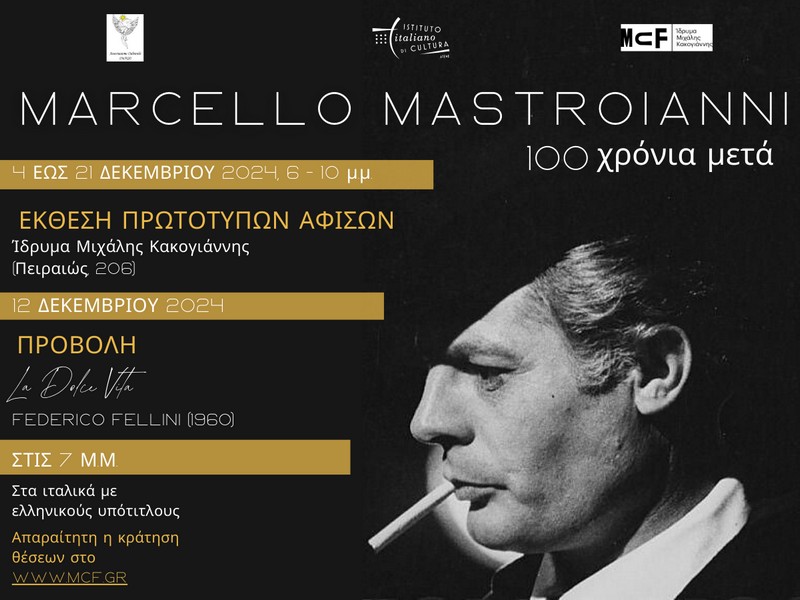 Το Ιταλικό Μορφωτικό Ινστιτούτο Αθηνών και το Ίδρυμα Μιχάλης Κακογιάννης, σε συνεργασία με τον πολιτισικό σύλλογο Imago, σας παρουσιάζουν την έκθεση Marcello Mastroianni - 100 χρόνια μετά, την οποία θα φιλοξενήσει το Ίδρυμα Μιχάλης Κακογιάννης (Πειραιώς 206) από τις 4 έως τις 21 Δεκεμβρίου 2024. Ώρες λειτουργίας: 18:00-22:00.Ελεύθερη είσοδος.