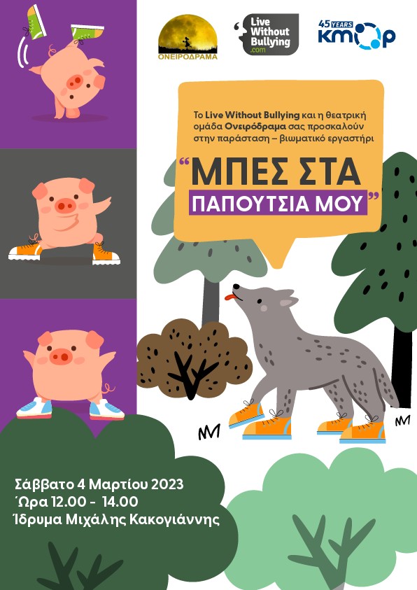 Με αφορμή την Πανελλήνια Ημέρα κατά της Σχολικής Βίας και του Εκφοβισμού στις 6 Μαρτίου, tο Live Without Bullying και η θεατρική ομάδα Ονειρόδραμα διοργανώνουν τη θεατρική παράσταση - βιωματικό εργαστήριο «ΜΠΕΣ ΣΤΑ ΠΑΠΟΥΤΣΙΑ ΜΟΥ», το Σάββατο 4 Μαρτίου 2023 και ώρα 12.00-14.00, στο Ίδρυμα Μιχάλης Κακογιάννης (Πειραιώς 206, Αθήνα).