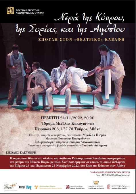 Η παράσταση «Νερά της Κύπρου, της Συρίας, και της Αιγύπτου. Σπουδή στον "θεατρικό" Καβάφη» βασίζεται σε ολόκληρη την ποίηση του Κ. Π. Καβάφη (Αναγνωρισµένα, Αποκηρυγµένα, Ανέκδοτα και Ατελή) και συνδυάζει εκείνα τα ποιήµατα όπου ο Αλεξανδρινός αξιοποιεί τεχνικές και στοιχεία της δραµατικής τέχνης.