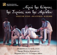 Η παράσταση «Νερά της Κύπρου, της Συρίας, και της Αιγύπτου. Σπουδή στον "θεατρικό" Καβάφη» βασίζεται σε ολόκληρη την ποίηση του Κ. Π. Καβάφη (Αναγνωρισµένα, Αποκηρυγµένα, Ανέκδοτα και Ατελή) και συνδυάζει εκείνα τα ποιήµατα όπου ο Αλεξανδρινός αξιοποιεί τεχνικές και στοιχεία της δραµατικής τέχνης.