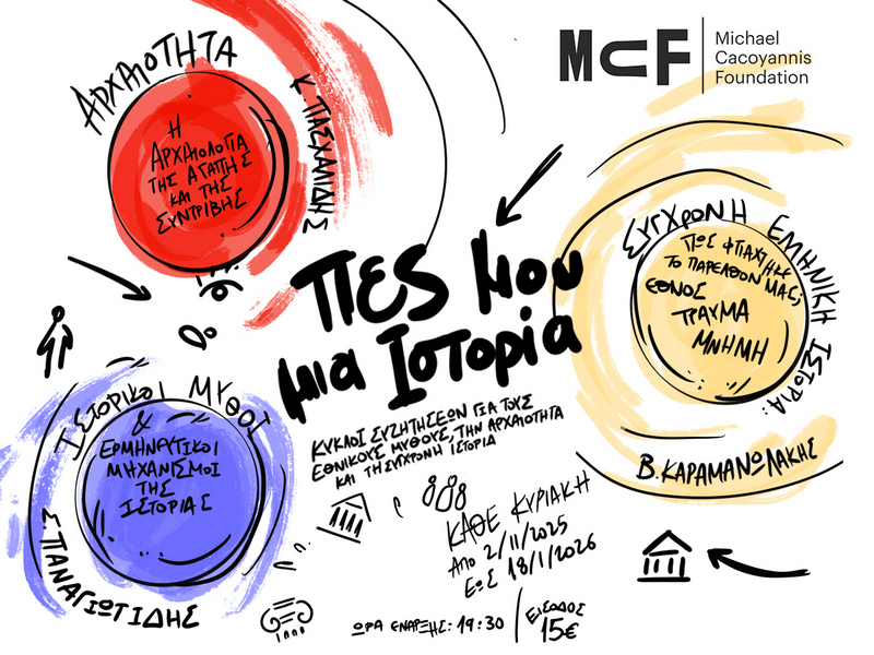 Το Ίδρυμα Μιχάλης Κακογιάννης ανοίγει δημιουργικό διάλογο με το παρελθόν παρουσιάζοντας τρεις κύκλους συζητήσεων, με τίτλο «Πες μου μια Ιστορία», που διατρέχουν την αρχαιότητα και τη σύγχρονη ελληνική ιστορία και αναδεικνύουν μύθους που έχουν καθορίσει την ελληνική ταυτότητα.