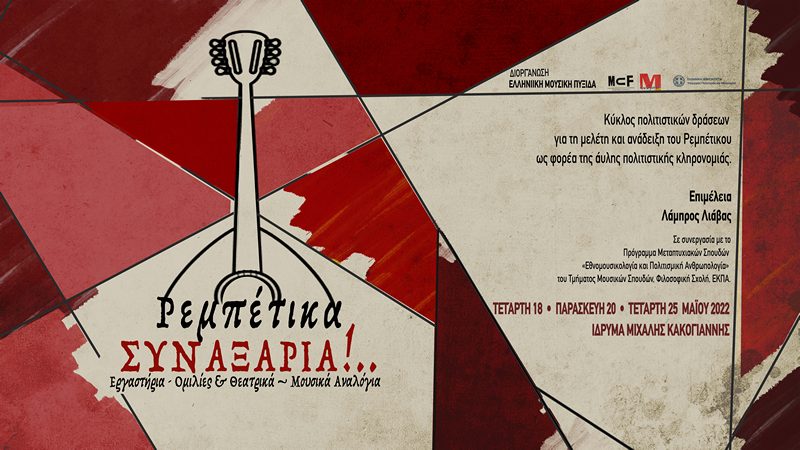 Με αφορμή την εγγραφή του Ρεμπέτικου στον Διεθνή Κατάλογο της Ουνέσκο για την Άυλη Πολιτιστική Κληρονομιά, στις 18, 20 & 25 Μαΐου 2022 θα γίνουν στο Ίδρυμα Μιχάλης Κακογιάννης μια σειρά πολιτιστικών δράσεων με γενικό τίτλο «Ρεμπέτικα Συναξάρια».