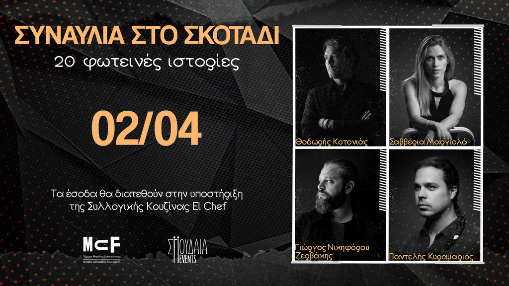 Την Τρίτη 2 Απριλίου ο Θοδωρής Κοτονιάς, η Σαββέρια Μαργιολά, ο Γιώργος Νικηφόρου Ζερβάκης και ο Παντελής Κυραμαργιός ανεβαίνουν στη σκηνή του Ιδρύματος Μιχάλης Κακογιάννης χαρίζοντάς μας «20 φωτεινές ιστορίες», για μία μοναδική συναυλία στο σκοτάδι με σκοπό την υποστήριξη της Συλλογικής Κουζίνας «El Chef».