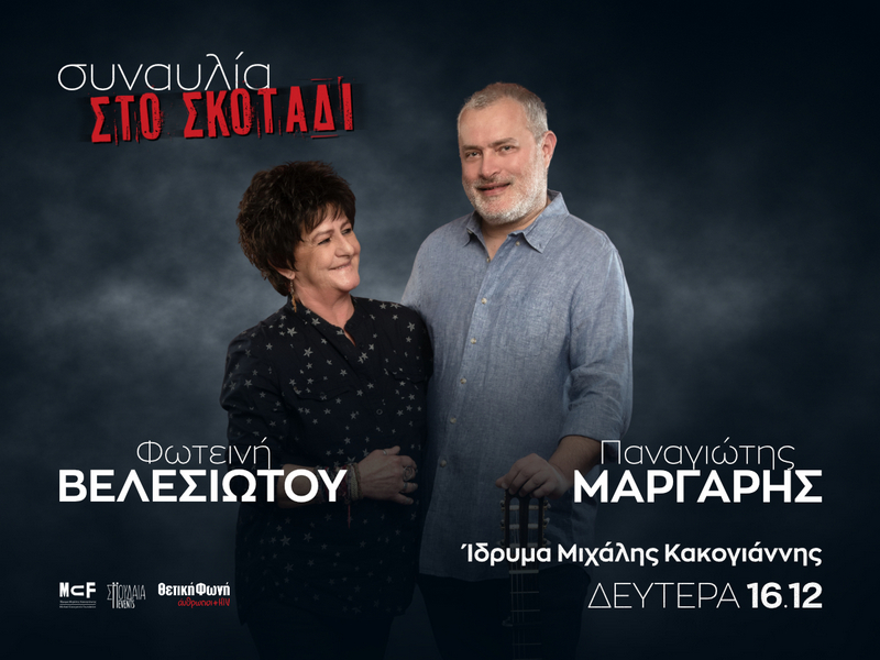 Την Δευτέρα 16 Δεκεμβρίου η πηγαία ερμηνεύτρια Φωτεινή Βελεσιώτου και ο βιρτουόζος κλασικός κιθαρίστας και συνθέτης Παναγιώτης Μάργαρης έρχονται στη σκηνή του ιδρύματος Μιχάλης Κακογιάννης, με μια καλλιτεχνική πρόταση με μοναδικό ειδικό βάρος και μας παρουσιάζουν τα παντοτινά διαμάντια του Μούτση, του Βίρβου, του Καλδάρα, του Γκάτσου, του Ξαρχάκου, του Ρασούλη κ.α. αλλά και τραγούδια σταθμούς από τη δισκογραφία της Φωτεινής (Μέλισσες, Διόδια κ.α.).