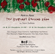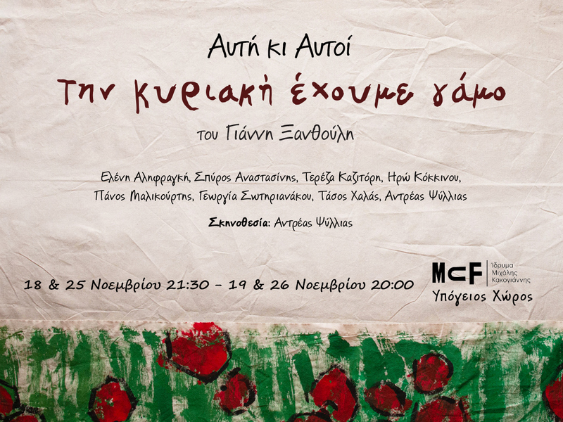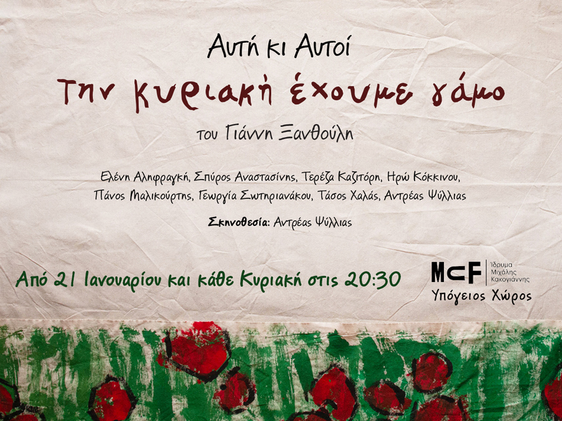 Μετά την μεγάλη ανταπόκριση του κοινού, η παράσταση της ομάδας «Αυτή κι Αυτοί» επιστρέφει στο  Ίδρυμα Μιχάλης Κακογιάννης (Υπόγειος Χώρος) με το έργο από το ομώνυμο βιβλίο του Γιάννη Ξανθούλη, «Την Κυριακή έχουμε γάμο».