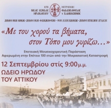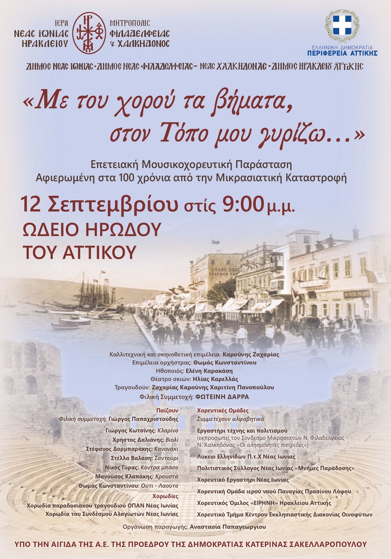 Με αφορμή την συμπλήρωση 100 ετών από την θλιβερή επέτειο της Μικρασιατικής Καταστροφής, η Ιερά Μητρόπολη Νέας Ιωνίας, Φιλαδελφείας, Ηρακλείου και Χαλκηδόνος τιμά τις ρίζες της στο Ωδείο Ηρώδου του Αττικού με μία επετειακή μουσικοχορευτική εκδήλωση με τίτλο: