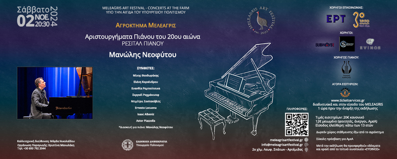 Ρεσιτάλ πιάνου με τον Κύπριο, διεθνούς φήμης σολίστ, Μανώλη Νεοφύτου - απόφοιτο της Εξειδικευμένης Κεντρικής Μουσικής Σχολής και του Ωδείου Τσαϊκόφσκυ της Μόσχας, βραβευμένο σε διεθνείς διαγωνισμούς πιάνου. Ο γνωστός για τον λυρισμό του Μανώλης Νεοφύτου θα μας παρουσιάσει έργα του Μίκη Θεοδωράκη, καθώς και μουσική από τις ταινίες Πολίτικη Κουζίνα και Μια αιωνιότητα και μια μέρα των Ευανθίας Ρεμπούτσικα και Ελένης Καραΐνδρου, αντιστοίχως, σε δικές του διασκευές για σόλο πιάνο. Θα ερμηνεύσει, επίσης, διάσημα έργα του πιανιστικού ρεπερτορίου των Sergei Rachmaninov, Dmitrii Shostakovich, Ernesto Lecuona, Isaac Albeniz και Astor Piazzola.