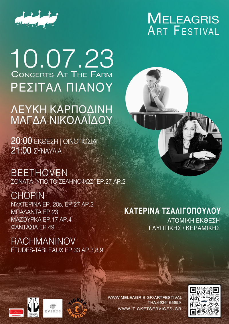 Το ίδιο βράδυ, το Αγρόκτημα Μελεαγρίς υποδέχεται την έκθεση κεραμικής-γλυπτικής της Κατερίνας Τσαλιγοπούλου.