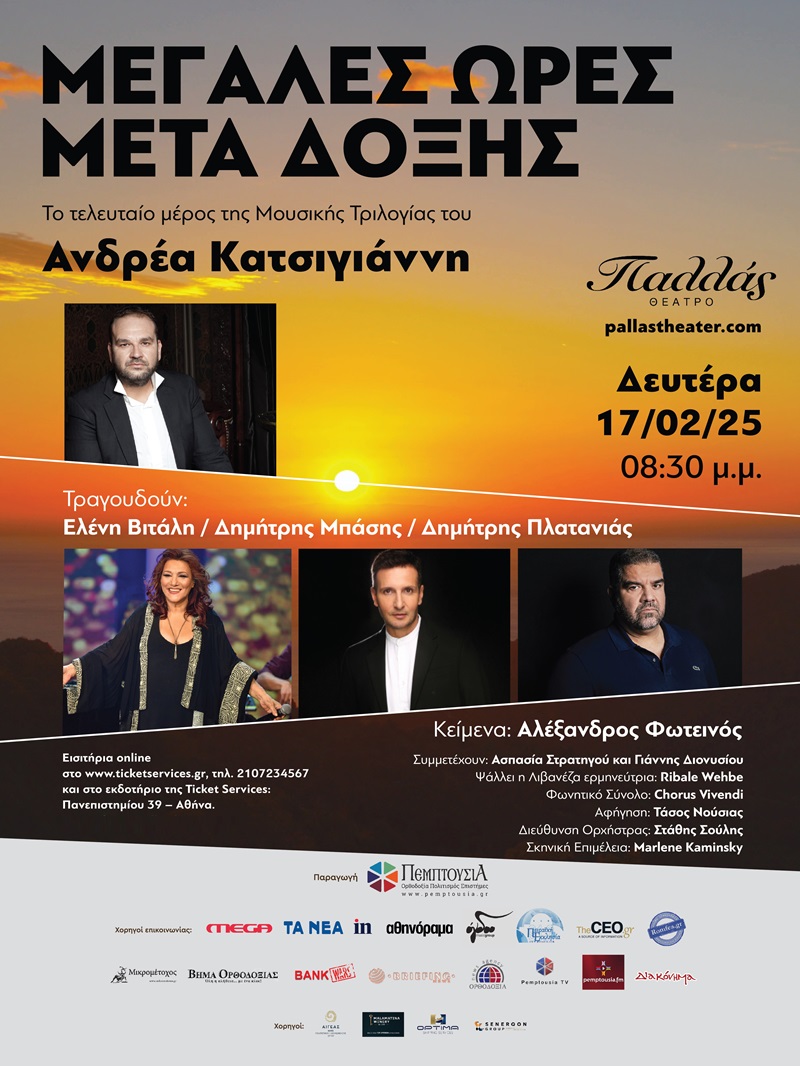 Το νέο έργο του Ανδρέα Κατσιγιάννη που ακολουθεί τις τελευταίες μέρες του Ιησού, την πορεία στο δράμα, στο θάνατο και την Μετά Δόξης πορεία στο Φώς και την αιωνιότητα θα παρουσιαστεί στο θέατρο Παλλάς τη Δευτέρα 17 Φεβρουαρίου 2025, ώρα 8:30 μ.μ. Μετά Δόξης είναι και ο τελευταίος κύκλος από την τριλογία του συνθέτη με τον τίτλο Μεγάλες Ώρες. Τους στίχους υπογράφει ο Αλέξανδρος Φωτεινός που έχει υπογράψει τα περισσότερα έργα των Μεγάλων Ωρών.