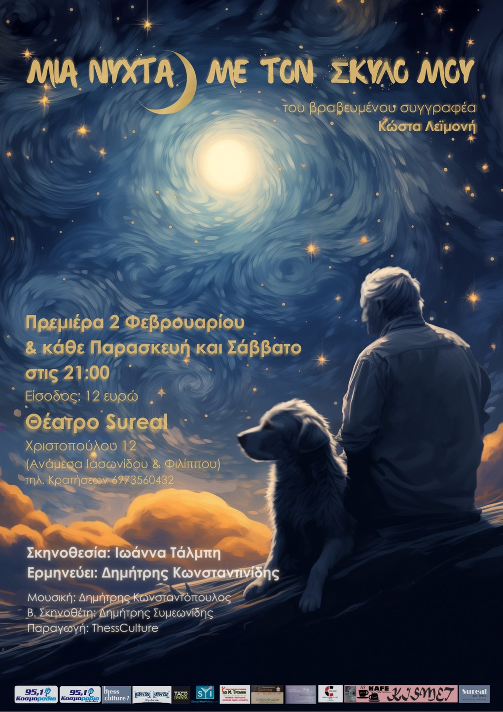 Το «Μια νύχτα με τον σκύλο μου» αποτελεί το τρίτο θεατρικό έργο του βραβευμένου συγγραφέα Κώστα Λεϊμονή, το οποίο ανεβαίνει στη θεατρική σκηνή σε πανελλήνια πρώτη στη Θεσσαλονίκη και στο Θέατρο Sureal.