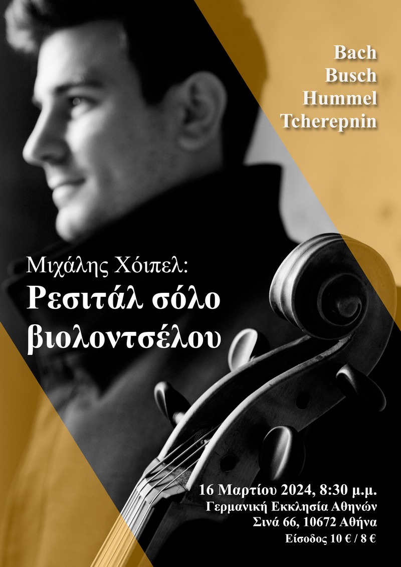 Στις 16 Μαρτίου, ο διεθνώς αναγνωρισμένος βιολοντσελίστας Μιχάλης Χόιπελ θα πραγματοποιήσει ένα ρεσιτάλ για σόλο βιολοντσέλο στη Γερμανική Εκκλησία Αθηνών (Σινά 66). Παράλληλα με την μουσική ερμηνεία, ο σολίστ παρουσιάζει τους συσχετισμούς μεταξύ των έργων και τις ιστορίες που κρύβουν, προσκαλώντας το κοινό σε μια πιο άμεση επαφή με τη μουσική.