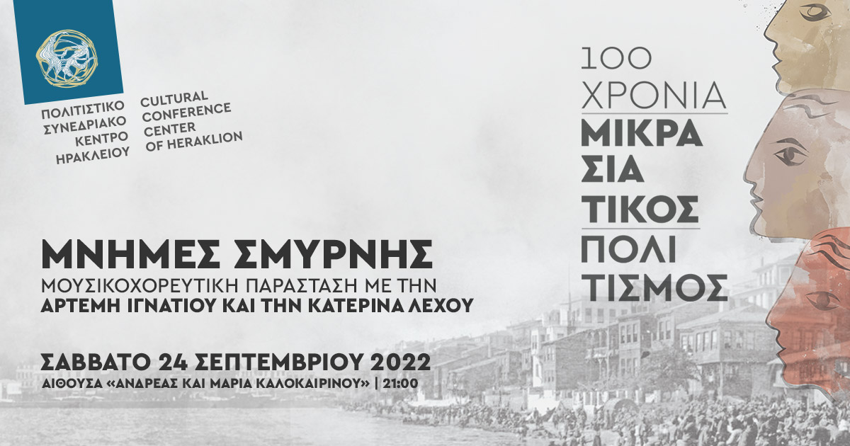 Τιμώντας τη θλιβερή επέτειο της συμπλήρωσης των 100 χρόνων από τη Μικρασιατική Καταστροφή, το Πολιτιστικό Συνεδριακό Κέντρο Ηρακλείου την προτελευταία ημέρα του Αφιερώματός του παρουσιάζει την παράσταση Μνήμες Σμύρνης, στην οποία αλληλεπιδρούν ο χορός, η μουσική και ο λόγος, για να μας μεταφέρουν στην ατμόσφαιρα της ζωής στη Σμύρνη πριν και κατά τη διάρκεια του ξεριζωμού των Ελλήνων.