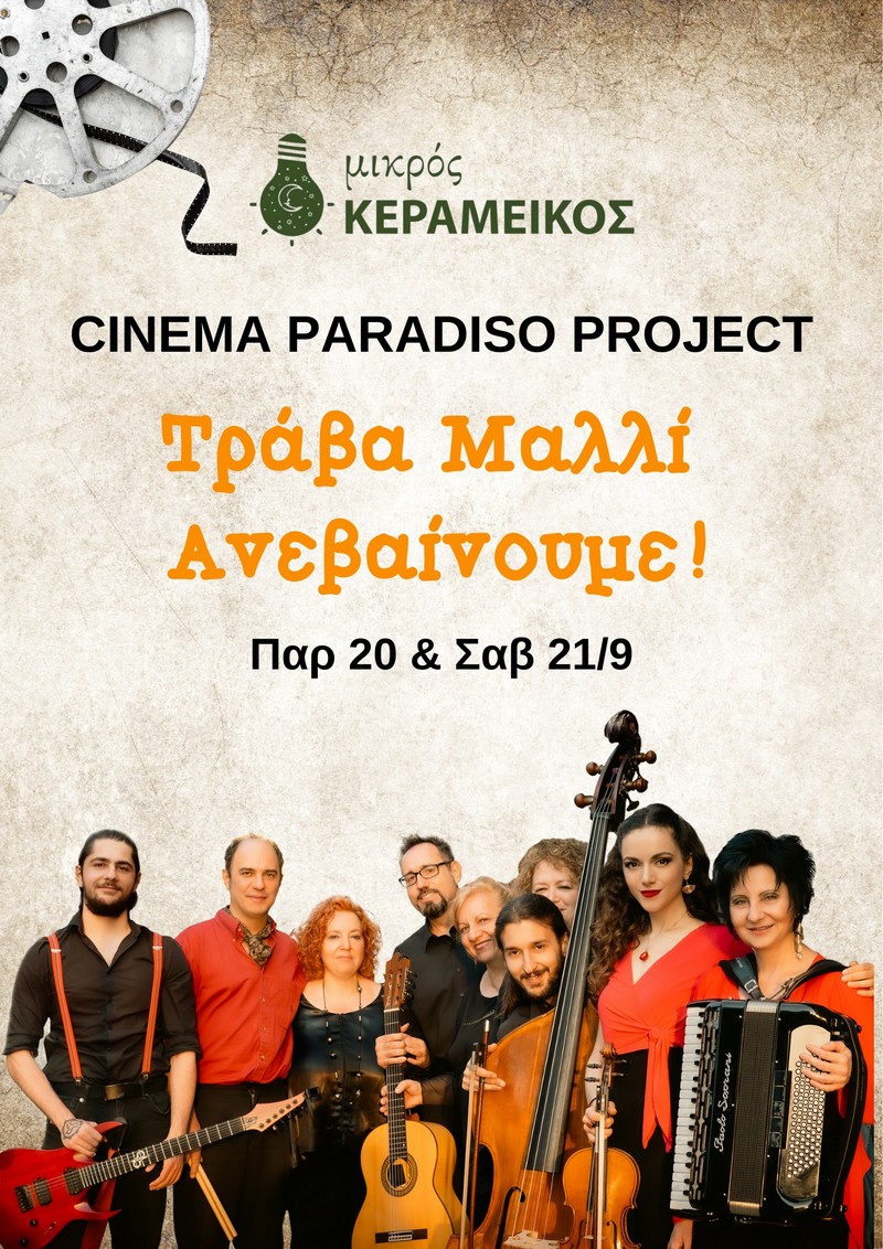 Οι Cinema Paradiso Project επιστρέφουν στο Μικρό Κεραμεικό. Η 10-μελής ορχήστρα που διασκευάζει τις νότες που έντυσαν τα κινηματογραφικά μας όνειρα μεταφέρει το ταξίδι από τη μεγάλη οθόνη στη θεατρική σκηνή του Μικρού Κεραμεικού. Μετά την επιτυχία των παραστάσεων του σχήματος τον περασμένο Μάιο, έρχονται ξανά με το αφιέρωμά τους στον Ελληνικό Κινηματογράφο. Βιώματα και αναμνήσεις μέσα από συγκλονιστικά τραγούδια από το σύγχρονο σινεμά αλλά και από τη λεγόμενη “χρυσή εποχή” του Ελληνικού Κινηματογράφου, ζωντανεύουν μέσα σε μια μαγική ατμόσφαιρα που διαμορφώνουν οι παράλληλες προβολές και η ερμηνεία μιας από τις πιο αισθαντικές φωνές. Μια παράσταση που αγαπά τον έρωτα, την περιπέτεια αλλά και το χιούμορ με τις ανεπανάληπτες ατάκες. “Τράβα μαλλί ανεβαίνουμε” είναι ο τίτλος της παράστασης με την οποία οι Cinema Paradiso Project απογειώνονται με τα soundtrack του Ελληνικού κινηματογράφου!