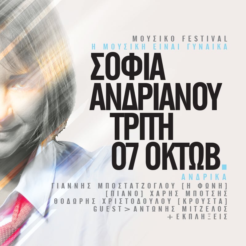 Την Τρίτη 7 Οκτωβρίου 2025, 9μμ στα πλαίσια του Φεστιβάλ «Η Μουσική είναι Γυναίκα» έρχεται για 1η φορά στο Θέατρο «Μικρός Κεραμεικός» η Σοφία Ανδριανού μαζί με τα «Ανδρικά» της. Ως μια γυναίκα που μπορεί να αγαπά και να γεννά Ανθρώπους (Γυναίκες κι Άνδρες) παρουσιάζει μια Μουσική Παράσταση αφιερωμένη στα όμορφα Αντρικά πρότυπα, στα όμορφα Γυναικεία πρότυπά δηλαδή στους όμορφους Ανθρώπους..