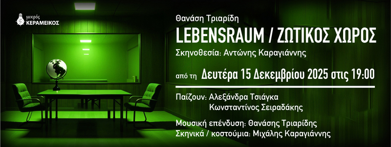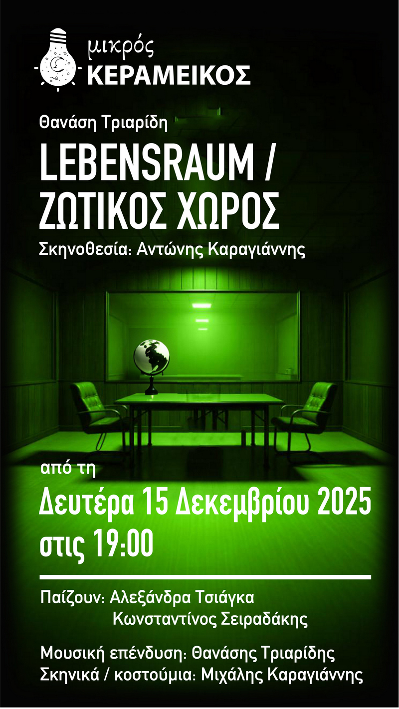 LEBENSRAUM ή αλλιώς Ζωτικός χώρος. Το έργο του Θανάση Τριαρίδη σε σκηνοθεσία Αντώνη Καραγιάννη, με την Αλεξάνδρα Τσιάγκα και τον Κωνσταντίνο Σειραδάκη στο θέατρο Μικρός Κεραμεικός. Από τη Δευτέρα 8 Δεκεμβρίου 2025 και κάθε Δευτέρα στις 19:00.