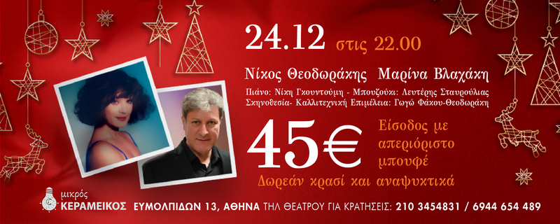 Ο αγαπημένος ερμηνευτής Νίκος Θεοδωράκης, συναντά τη μεγαλη κυρια του ελληνικού τραγουδιού Μαρίνα Βλαχάκη και σκοπεύουν να χαρίσουν στο κοινό, μια μαγικη παραμονη, γεμάτη κέφι και νοσταλγία, ερμηνεύοντας μεγάλες επιτυχίες.