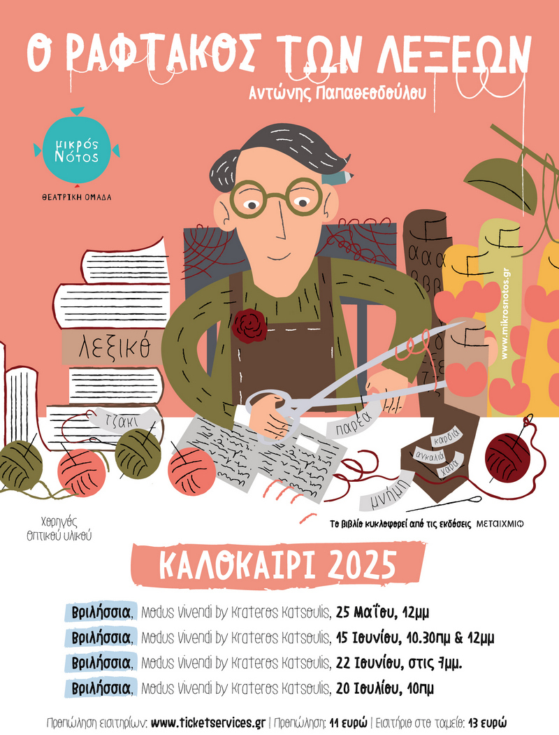 Η θεατρική ομάδα Μικρός Νότος ζωντανεύει το βιβλίο του Αντώνη Παπαθεοδούλου «Ο Ραφτάκος των λέξεων», που κυκλοφορεί από τις εκδόσεις ΜΕΤΑΙΧΜΙΟ, σε θεατρική διασκευή της Τίνας Γιωτοπούλου, σκηνοθεσία του Γιώργου Τζαβάρα, πρωτότυπη μουσική του Νίκου Πλατύραχου και καλλιτεχνική επιμέλεια της Χρύσας Διαμαντοπούλου.