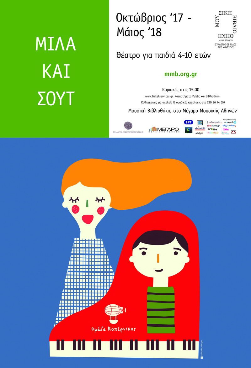 Η Μουσική Βιβλιοθήκη «Λίλιαν Βουδούρη» στο Μέγαρο Μουσικής ανανεώνει και φέτος τη συνεργασία της με την, γνωστή πλέον στο παιδικό κοινό, ΟΜΑΔΑ ΚΟΠΕΡΝΙΚΟΣ, η οποία μετά τις παραστάσεις της «Τα Μεγάλα Ψέματα του μικρού Ερμή» (2013-15) και «Απαγορεύεται η Μουσική!» (2014-16) που αγαπήθηκαν πολύ από τους μικρούς φίλους, συνεχίζει για 2η χρονιά την επιτυχημένη απολαυστική μουσικοθεατρική παράσταση «Μίλα και Σουτ»!