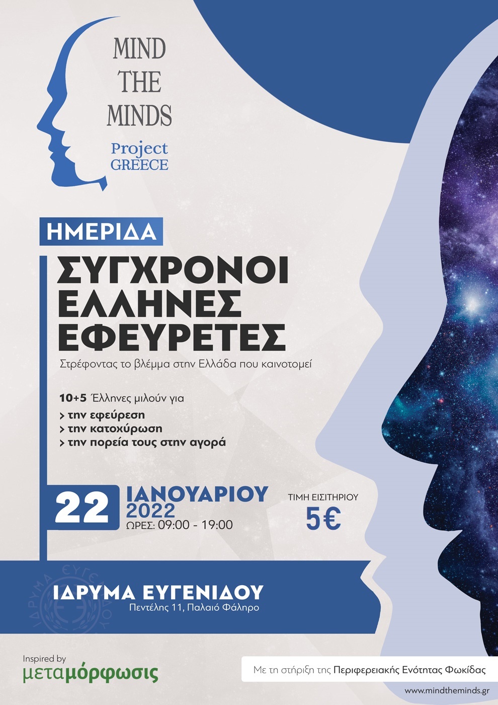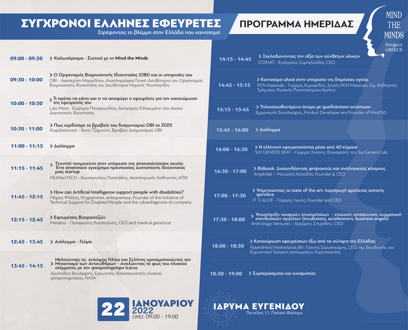 Το Σάββατο 22 Ιανουαρίου 2022 στο Ίδρυμα Ευγενίδου μεταξύ 9π.μ και 7μ.μ. η αστική μη κερδοσκοπική εταιρία Mind the minds πραγματοποιεί εκδήλωση με στόχο τη γνωριμία του ευρύτερου κοινού με 10 σύγχρονους µΈλληνες εφευρέτες και 5 ειδήμονες από την αγορά της κατοχύρωσης εφευρέσεων και ευρεσιτεχνιών.
