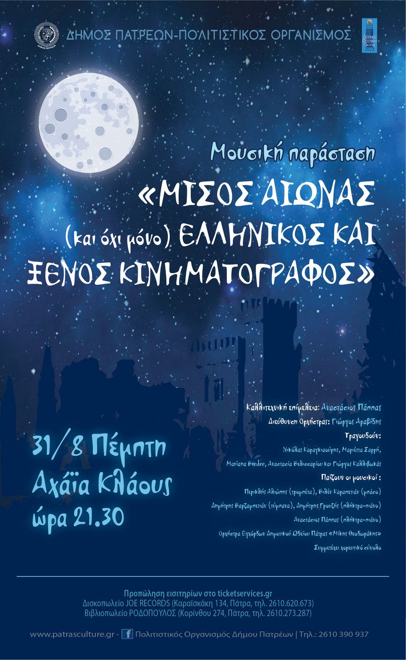 Ελληνικός και ξένος κινηματογράφος»... υποδέχεται την πανσέληνο στις 31 Αυγούστου, ο Πολιτιστικός Οργανισμός του Δήμου Πατρέων, στο χώρο της Αχάια Κλάους, στις 9.30 μ.μ.