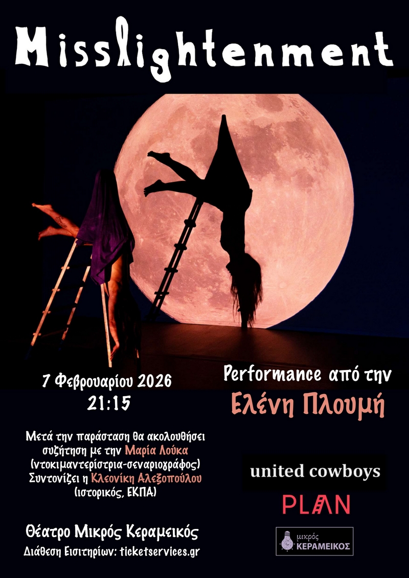 Μετά από μια πορεία παραστάσεων σε ευρωπαϊκές σκηνές, η χορογράφος και ερμηνεύτρια Ελένη Πλουμή φέρνει για πρώτη φορά στην Ελλάδα το Misslightenment, μια σωματική και εικαστική performance που, μέσα από το φως, τη σκιά και τη μυθολογία, διερευνά πώς το ανδρικό βλέμμα επισκιάζει τις ιστορίες των γυναικών και πώς το σώμα μπορεί να διεκδικήσει την επανεγγραφή τους.