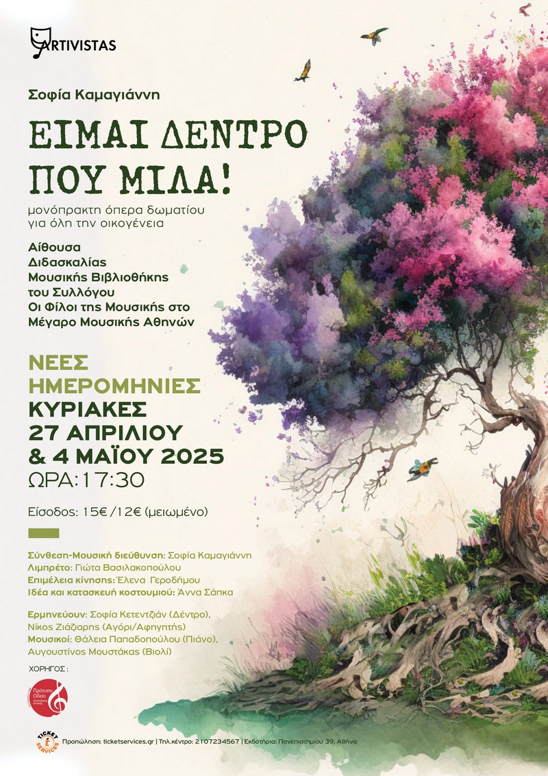 Το πρωτότυπο έργο μουσικού θεάτρου της συνθέτριας Σοφίας Καμαγιάννη, με τίτλο «ΕΙΜΑΙ ΔΕΝΤΡΟ ΠΟΥ ΜΙΛΑ», μας προσκαλεί σε μια αφύπνιση όσον αφορά στη σύνδεσή μας με τη φύση, και πιο ειδικά με το θαυμαστό κόσμο των δέντρων. Πρόκειται για μια τρυφερή και συγκινητική μονόπρακτη όπερα δωματίου, σε λιμπρέτο της Γιώτας Βασιλακοπούλου, όπου η ιστορία ενός αγοριού της πόλης και ενός δέντρου γίνεται η αφορμή για να αποκαλυφθούν τα μυστικά τους.