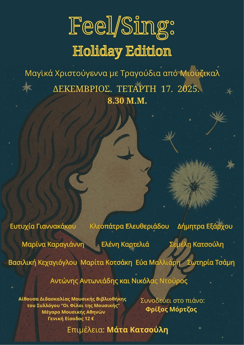 Η βραδιά μας θα περιλαμβάνει άριες από μιούζικαλ και ταινίες Disney που αγαπάμε, πλαισιωμένες από τραγούδια κατανυκτικού ύφους του κλασικού ρεπερτορίου και γνώριμα χριστουγεννιάτικα τραγούδια , για να κλείσουμε τη βραδιά ενώνοντας τις φωνές μας. Θα ακουστούν αποσπάσματα από τα έργα The Sound of Music, Les Miserables, Cats, The Phantom of the Opera, The Wizard of Oz, My Fair Lady, West Side Story, Pocahontas, Mulan, Beauty and the Beast κ.α. καθώς κι εμβληματικές άριες και τραγούδια των Handel, Caccini, Schubert, μαζί με πολλά γνώριμα χριστουγεννιάτικα τραγούδια για να αισθανθούμε τη ζεστασιά των Αγίων Ημερών.
