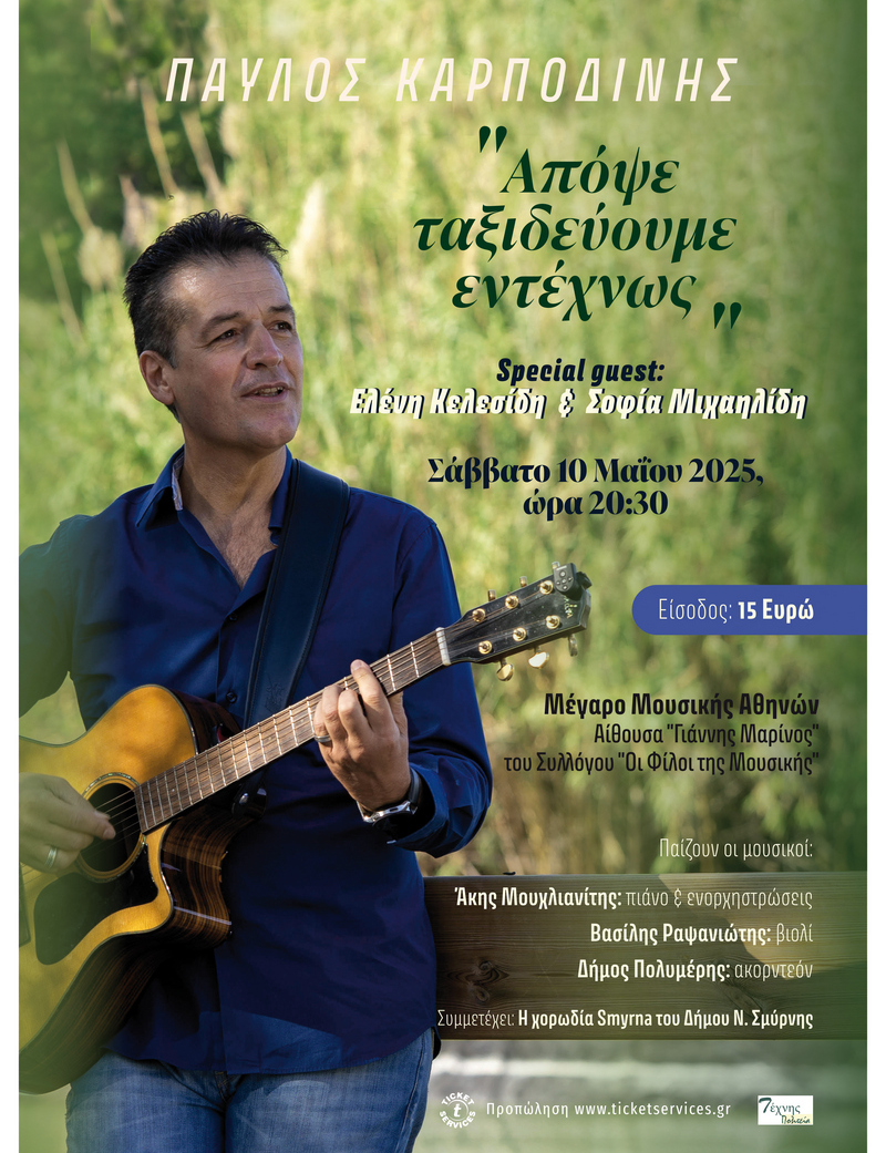 Ο Παύλος Καρποδίνης, ένας αγαπημένος καλλιτέχνης με σταθερά και σημαντικά βήματα στο χώρο της μουσικής, έρχεται για μια μοναδική βραδιά στο Μέγαρο μουσικής Αθηνών με εξαιρετική ομάδα μουσικών, σε ένα πρόγραμμα εφ' όλης της ύλης, το Σάββατο 10 Μαΐου στις 20:30.