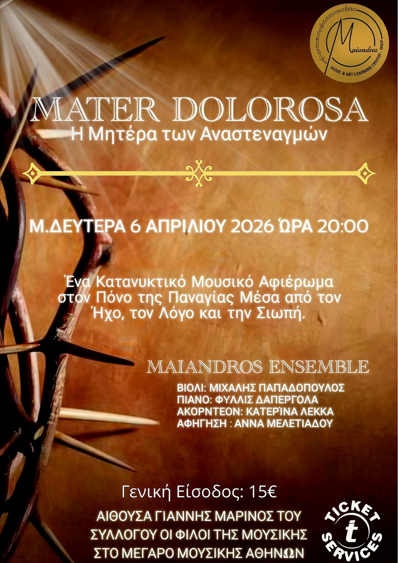 Το Maiandros Ensemble παρουσιάζει τη Μεγάλη Δευτέρα 6 Απριλίου 2026 και ώρα 20:00 στην Αίθουσα «Γιάννης Μαρίνος» του Συλλόγου Οι Φίλοι της Μουσικής στο Μέγαρο Μουσικής Αθηνών τη συναυλία «Mater Dolorosa - Η Μητέρα των Αναστεναγμών».