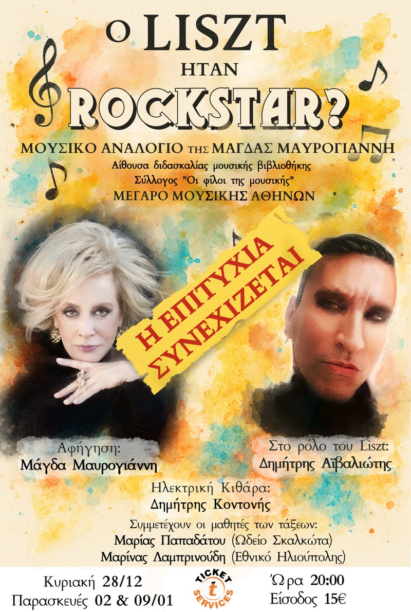 Έπειτα από τη θριαμβευτική sold out πρώτη βραδιά, η Αίθουσα Διδασκαλίας Μουσικής του Συλλόγου «Οι Φίλοι της Μουσικής» στο Μέγαρο Μουσικής Αθηνών ανοίγει ξανά τις πόρτες της για το Μουσικό Αναλόγιο της Μάγδας Μαυρογιάννη. Ένα εμπνευσμένο, διαφορετικό εγχείρημα, με τον εκκεντρικό καλλιτέχνη Δημήτρη Αϊβαλιώτη στον ρόλο του Liszt.