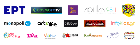 ΕΡΤ, Cosmote Tv, Tρίτο πρόγραμμα, Αθήνα 9.84, kidsradio.com, monopoli.gr, art&life.gr, deBop, Θεατρομάνια, infokids.gr, elamazi.gr, talk.gr, kidshub.gr, Elniplex, CityKidsGuide, Mom and the City, paidiko-theatro.gr
