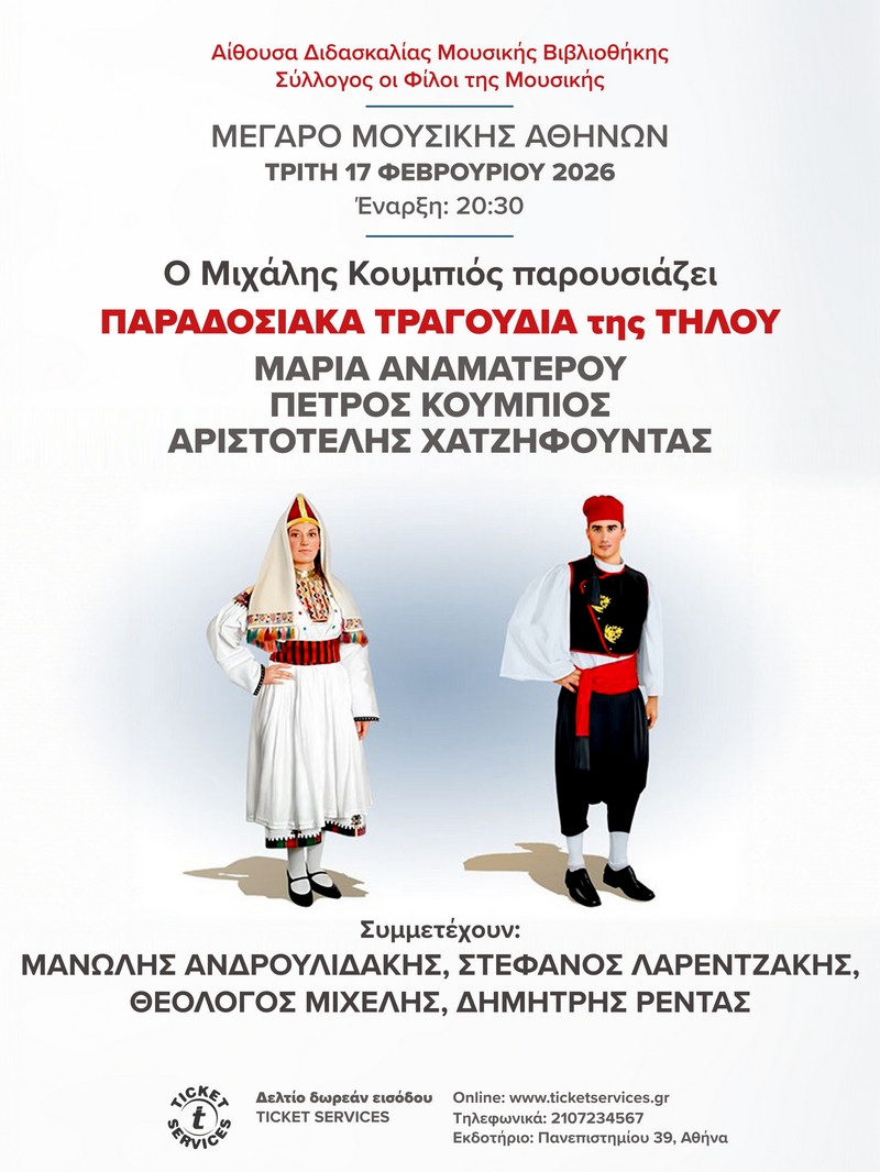 • Τρίτη 17 Φεβρουαρίου 2026, 20:30 ΠΑΡΑΔΟΣΙΑΚΑ ΤΡΑΓΟΥΔΙΑ της ΤΗΛΟΥ ΜΟΥΣΙΚΗ ΒΙΒΛΙΟΘΗΚΗ ΣΤΟ ΜΕΓΑΡΟ ΜΟΥΣΙΚΗΣ