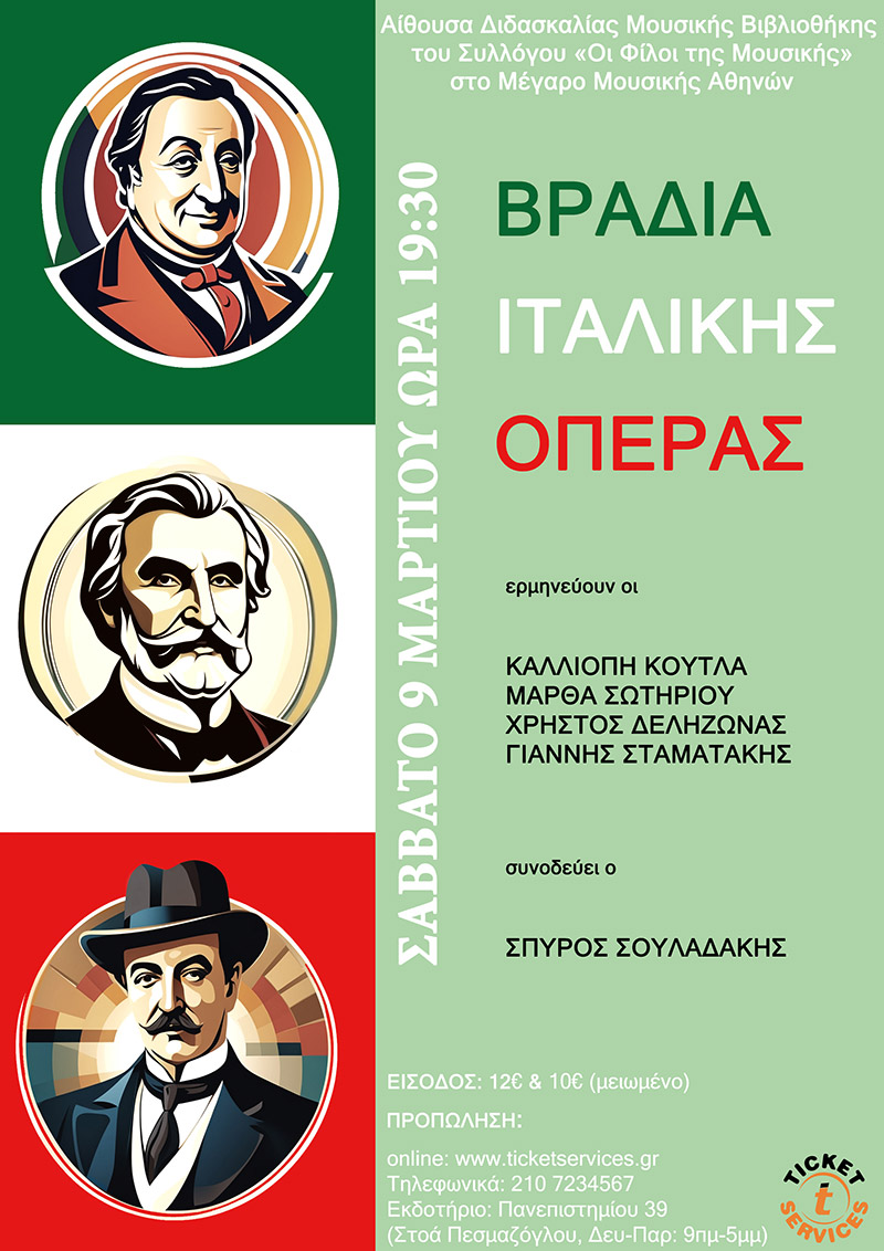 Ένα μουσικό αφιέρωμα στην ιταλική όπερα από την εποχή του μπελκάντο του 19ου αιώνα μέχρι τον βερισμό, μέσα από γνωστές άριες και ντουέτι μερικών από τους κύριους εκπροσώπους της (Rossini, Verdi, Puccini, Leoncavallo και Mascagni). Ερμηνεύουν η υψίφωνος Καλλιόπη Κούτλα, η μεσόφωνος Μάρθα Σωτηρίου, ο τενόρος Χρήστος Δεληζώνας και ο βαρύτονος Γιάννης Σταματάκης. Στο πιάνο συνοδεύει ο Σπύρος Σουλαδάκης.