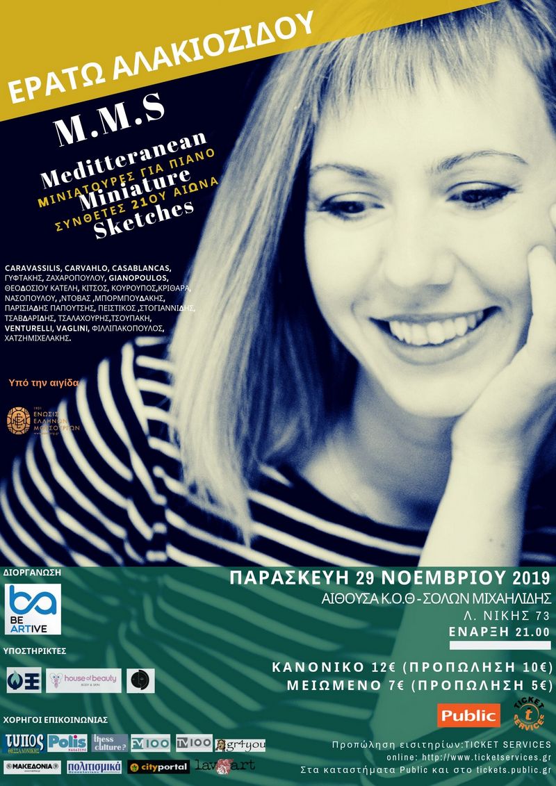 M.M.S| Medıterranean Mınıature Sketches τιτλοφορείται το νέο πρότζεκτ της Ερατούς Αλακιοζίδου. Η καταξιωμένη πιανίστα επιλέγει έργα Ελλήνων συνθετών, με τέτοιο τρόπο ώστε να μας αφηγηθεί μια ιστορία αισθαντικότητας και ευαισθησίας «μεσογειακού τύπου», όπως η ίδια λέει.