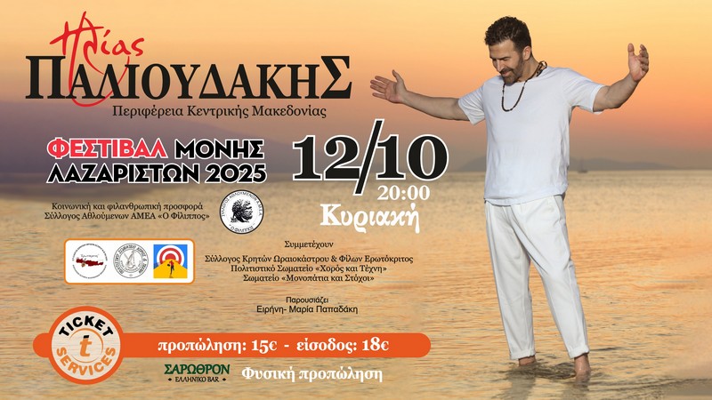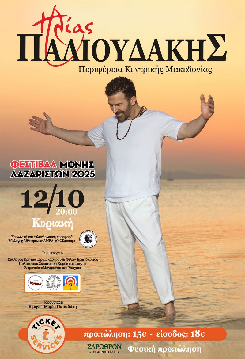 Την Κυριακή 12 Οκτωβρίου 2025, ο καταξιωμένος ερμηνευτής Ηλίας Παλιουδάκης ανεβαίνει στη σκηνή της Μονής Λαζαριστών για να μας χαρίσει μια βραδιά όπου το λαϊκό, το έντεχνο και το παραδοσιακό συναντιούνται με τον δικό του, μοναδικό τρόπο.