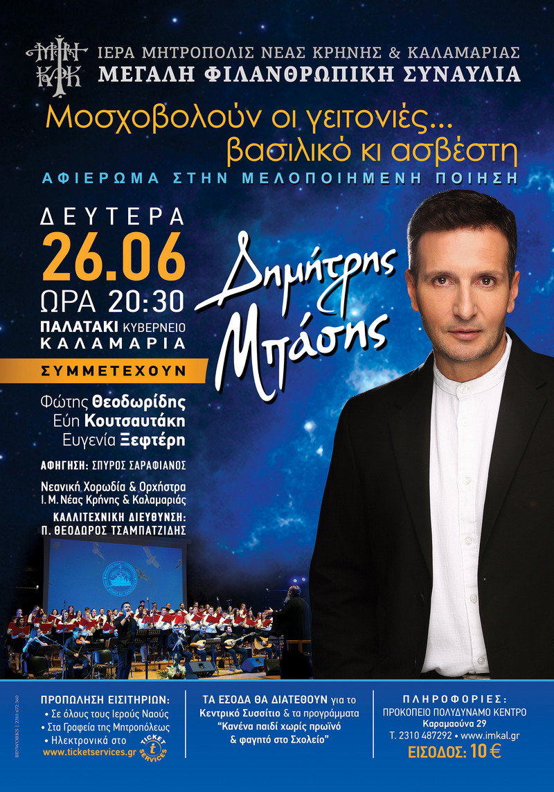 Η Νεανική Χορωδία και Ορχήστρα της Ιεράς Μητροπόλεως Νέας Κρήνης και Καλαμαριάς με τις ευλογίες του Σεβασμιωτάτου Ποιμενάρχου κ. Ιουστίνου παρουσιάζει ένα πλούσιο καλλιτεχνικό Αφιέρωμα - Συναυλία με τίτλο «Μοσχοβολούν οι γειτονιές βασιλικό κι ασβέστη».