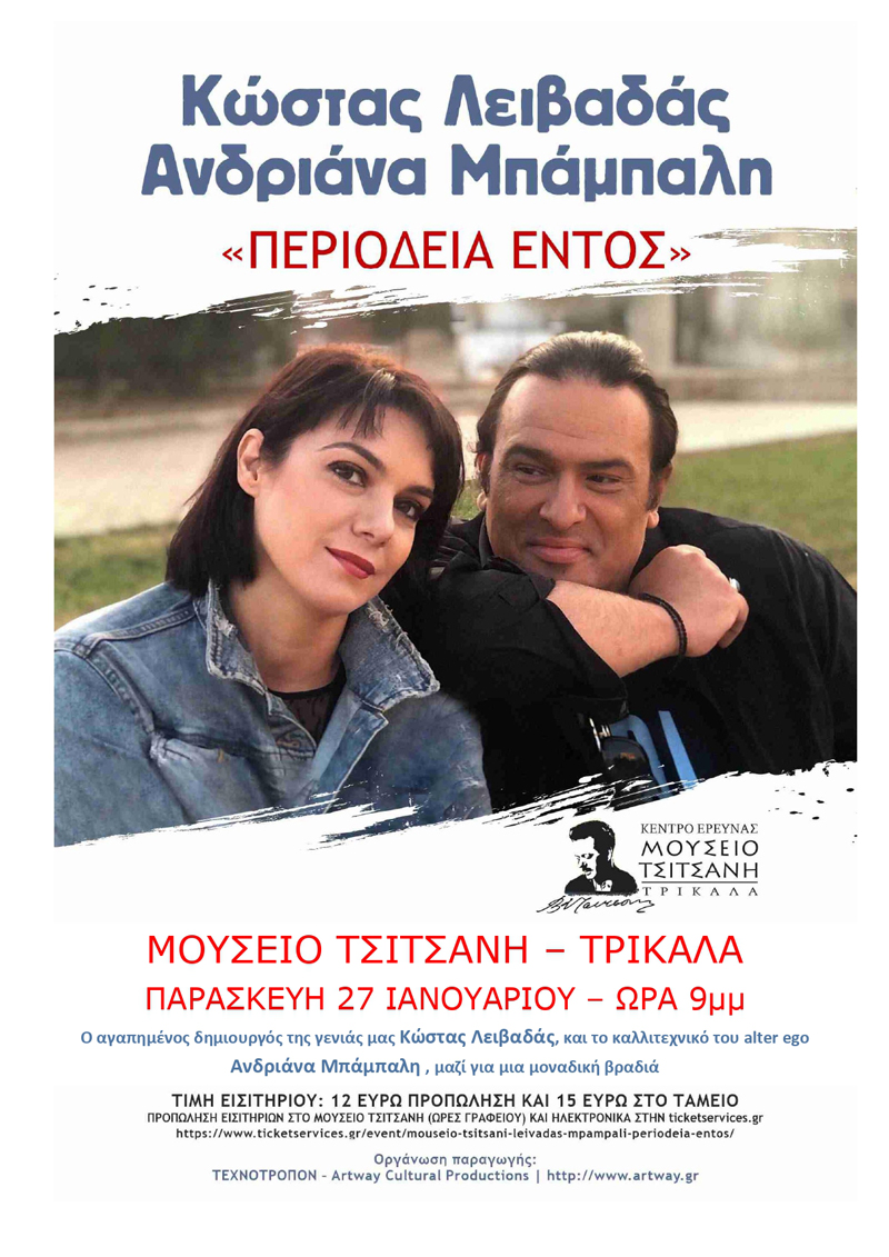 Ένας από τους πιο αγαπημένους δημιουργούς της γενιά μας, ο Κώστας Λειβαδάς, μαζί με το καλλιτεχνικό του alter ego, την Ανδριάνα Μπάμπαλη, υπόσχονται μια μοναδική βραδιά, στο Μουσείο Τσιτσάνη, κατά τη διάρκεια των γιορτινών ημερών, που έχουν την τιμητική τους στην πόλη των Τρικάλων, την Παρασκευή 27 Ιανουαρίου 2023.