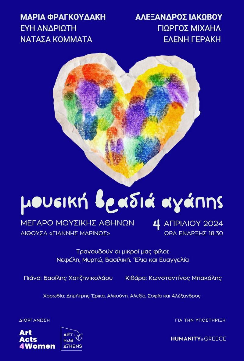 Όσοι λάβουν μέρος στην ενέργεια, θα παραλάβουν μία κάρτα μεγέθους καρτ ποστάλ στην οποία θα δημιουργήσουν το δικό τους έργο τέχνης. Στη συνέχεια οι καρτ ποστάλ αυτές θα διατεθούν προς πώληση διαδικτυακά στην ιστοσελίδα www.ArtActs4Women.com. Το σύνολο των εσόδων θα δοθεί ως δωρεά στην οργάνωση Humanity Greece. Η φετινή ενέργεια θα ολοκληρωθεί με μία Μουσική Βραδιά Αγάπης, στις 4 Απριλίου 2024, στο Μέγαρο Μουσικής Αθηνών. Στη μουσική αυτή γιορτή αυτή θα συμμετέχουν οι Εύη Ανδριώτη, Ελένη Γεράκη, Αλέξανδρος Ιακώβου, Νατάσα Κομματά, Γιώργος Μιχαήλ, και Μαρία Φραγκουδάκη. Η προπώληση εισιτηρίων θα γίνει από την ticketservices.gr