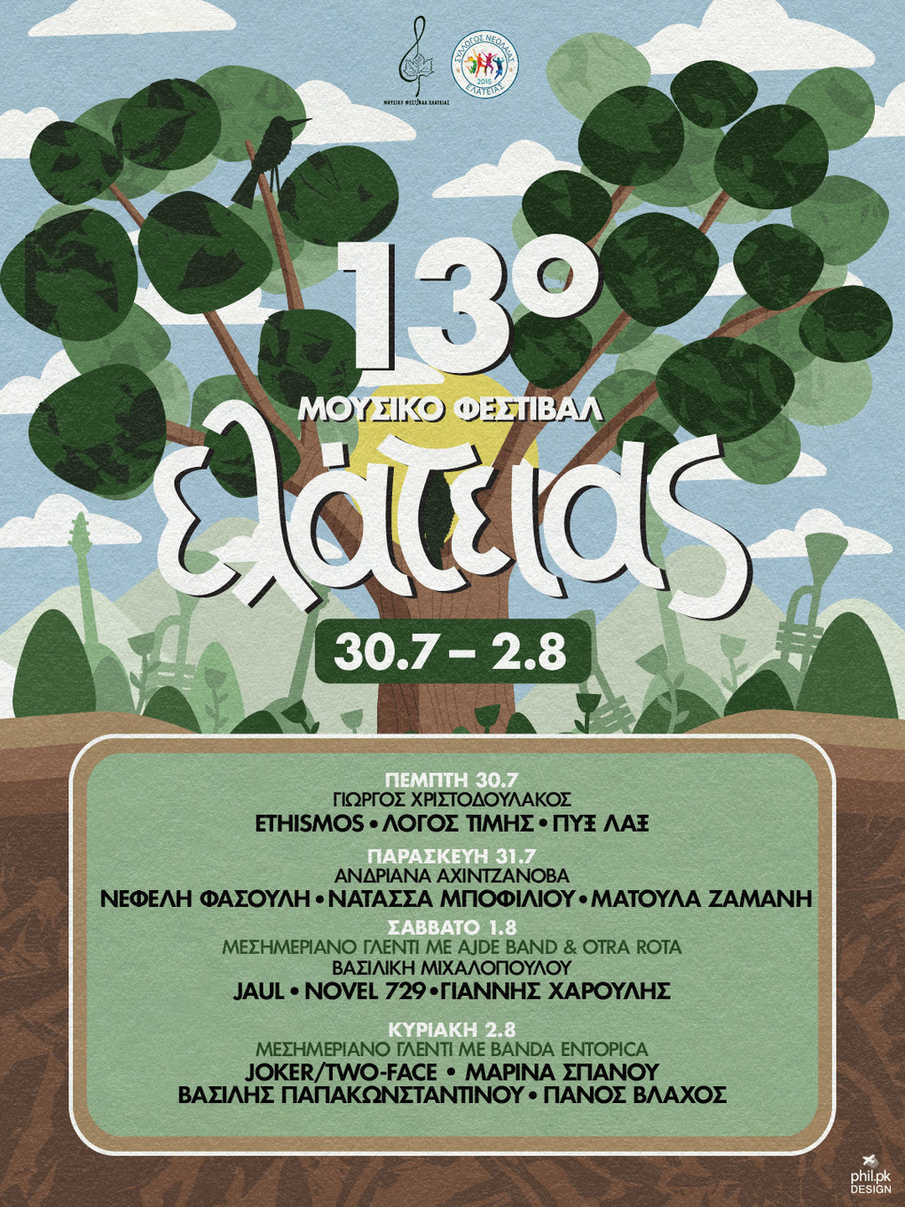 Ο Σύλλογος Νεολαίας Ελάτειας μας προσκαλεί στο 13ο Μουσικό Φεστιβάλ Ελάτειας, για να ζήσουμε όλοι μαζί μία μοναδική εμπειρία σε μια μαγευτική τοποθεσία μέσα στη φύση, ανάμεσα σε πλατάνια, πεύκα και τρεχούμενα νερά. Για ακόμη μία χρονιά, το φεστιβάλ της Ελάτειας γίνεται το σημείο συνάντησης της μουσικής, της παρέας και της ελευθερίας, σε ένα τετραήμερο γεμάτο εικόνες και στιγμές που θα σας μείνουν αξέχαστες. Μεγάλα ονόματα της ελληνικής και έντεχνης μουσικής σκηνής ανεβαίνουν στη σκηνή, σε μια σειρά από συναυλίες που θα πραγματοποιούνται κάθε βράδυ από την Πέμπτη έως και την Κυριακή, δημιουργώντας την απόλυτη φεστιβαλική ατμόσφαιρα. Και όταν η νύχτα δίνει τη θέση της στη μέρα, το γλέντι συνεχίζεται, κορυφώνοντας την εμπειρία με τα παραδοσιακά μεσημεριανά γλέντια του Σαββάτου και της Κυριακής, όπου η μουσική, ο χορός και η αυθεντική διασκέδαση γίνονται ένα.