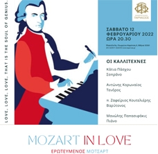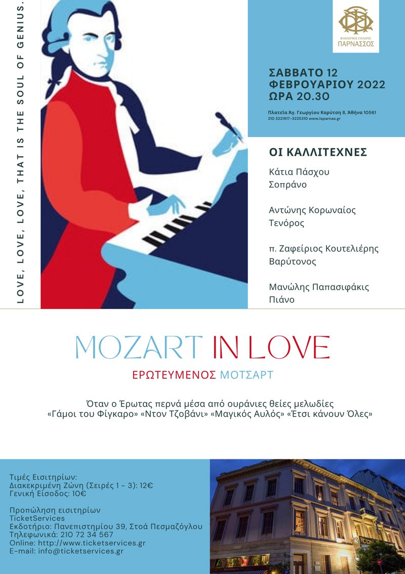 Το Σάββατο 12 Φεβρουαρίου 2022 τρεις εξαίρετοι λυρικοί καλλιτέχνες, οι: Κάτια Πάσχου (σοπράνο), Αντώνης Κορωναίος (τενόρος), π. Ζαφείριος Κουτελιέρης (βαρύτονος) και ο πιανίστας Μανώλης Παπασηφάκης ενώνουν τις φωνές και τις δυνάμεις τους για την γιορτή των ερωτευμένων σε μια μοναδική συναυλία μεταφέροντας το εκλεκτό κοινό από την εμβληματική αίθουσα του Φιλολογικού Συλλόγου Παρνασσού στο μαγικό κόσμο του Μότσαρτ, μέσα από τα πιο δημοφιλή αποσπάσματα των έργων του: «Έτσι κάνουν Όλες» «Γάμοι του Φίγκαρο» «Ντον Τζοβάνι» «Μαγικός Αυλός». Η βραδιά θα κλείσει με υπέροχες μουσικές εκπλήξεις!
