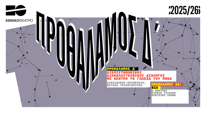 Το Εθνικό Θέατρο, την Κυριακή 8 Μαρτίου, Παγκόσμια Ημέρα της Γυναίκας, διοργανώνει στην Κεντρική Σκηνή του Κτηρίου Τσίλλερ, την έκτη -και τελευταία για τη φετινή καλλιτεχνική περίοδο- δράση «Προθάλαμος Δ' - Διεπιστημονικοί Διακαλλιτεχνικοί Διάλογοι», αντλώντας έμπνευση από τη θεματική του καλλιτεχνικού του προγράμματος για τον Μάρτιο, τη Βία. Σχεδιασμός - Επιμέλεια: Νατάσα Τριανταφύλλη.