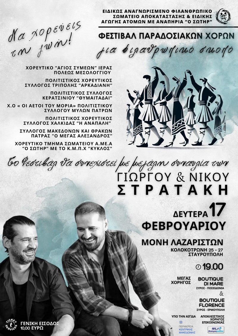 Το Σωματείο ΑμεΑ "Ο Σωτήρ" σας προσκαλεί σε μια μοναδική εκδήλωση παράδοσης και μουσικής την Δευτέρα 17 Φεβρουαρίου 2025, στις 19:00, στη Μονή Λαζαριστών στη Θεσσαλονίκη. Το σύνολο των εσόδων από την εκδήλωση θα διατεθεί υπέρ του Σωματείου ΑμεΑ "Ο Σωτήρ", ενισχύοντας το πολύτιμο έργο του για την υποστήριξη των ατόμων με αναπηρία.