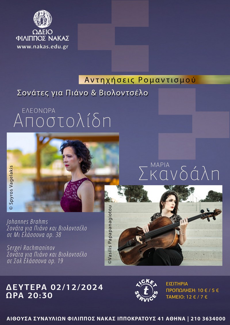 Οι διακεκριμένες μουσικοί, Ελεονώρα Αποστολίδη (πιάνο) και Μαρία Σκανδάλη (βιολοντσέλο), θα ερμηνεύσουν αυτές τις συνθέσεις με πάθος και δεξιοτεχνία, προσφέροντας μια εμπειρία γεμάτη συναισθηματικές αντιθέσεις και ένταση.