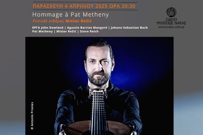 Ένα πολύ ενδιαφέρον πρόγραμμα αφιερωμένο στον σημαντικό Αμερικανό κιθαριστή και συνθέτη Pat Metheny παρουσιάζει ο διακεκριμένος Κροάτης κιθαριστής Mislav Režić την Παρασκευή 4 Απριλίου, ώρα 20:30 στην Αίθουσα Συναυλιών Φίλιππος Νάκας.