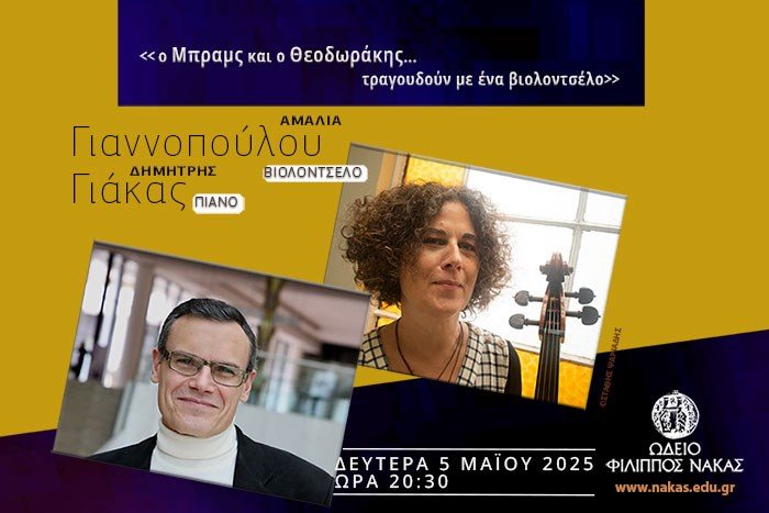 στις 8.30 μ.μ στην Αίθουσα Συναυλιών Φίλιππος Νάκας, η βιολοντσελίστα Αμαλία Γιαννοπούλου και ο πιανίστας Δημήτρης Γιάκας θα ερμηνεύσουν, μεταξύ άλλων, τραγούδια του Μίκη Θεοδωράκη, όπως-Δεν φταις εσύ που ταξιδεύω -Μαρίνα -Σίλβα -Κοιμήσου αγγελούδι μου και τραγούδια Brahms: -Liebestreu -Die Mainacht