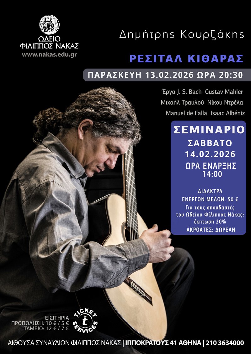 • Friday 13 February 2026, 20:30 Ρεσιτάλ Κιθάρας του Δημήτρη Κουρζάκη ΑΙΘΟΥΣΑ ΣΥΝΑΥΛΙΩΝ ΦΙΛΙΠΠΟΣ ΝΑΚΑΣ TICKETS
