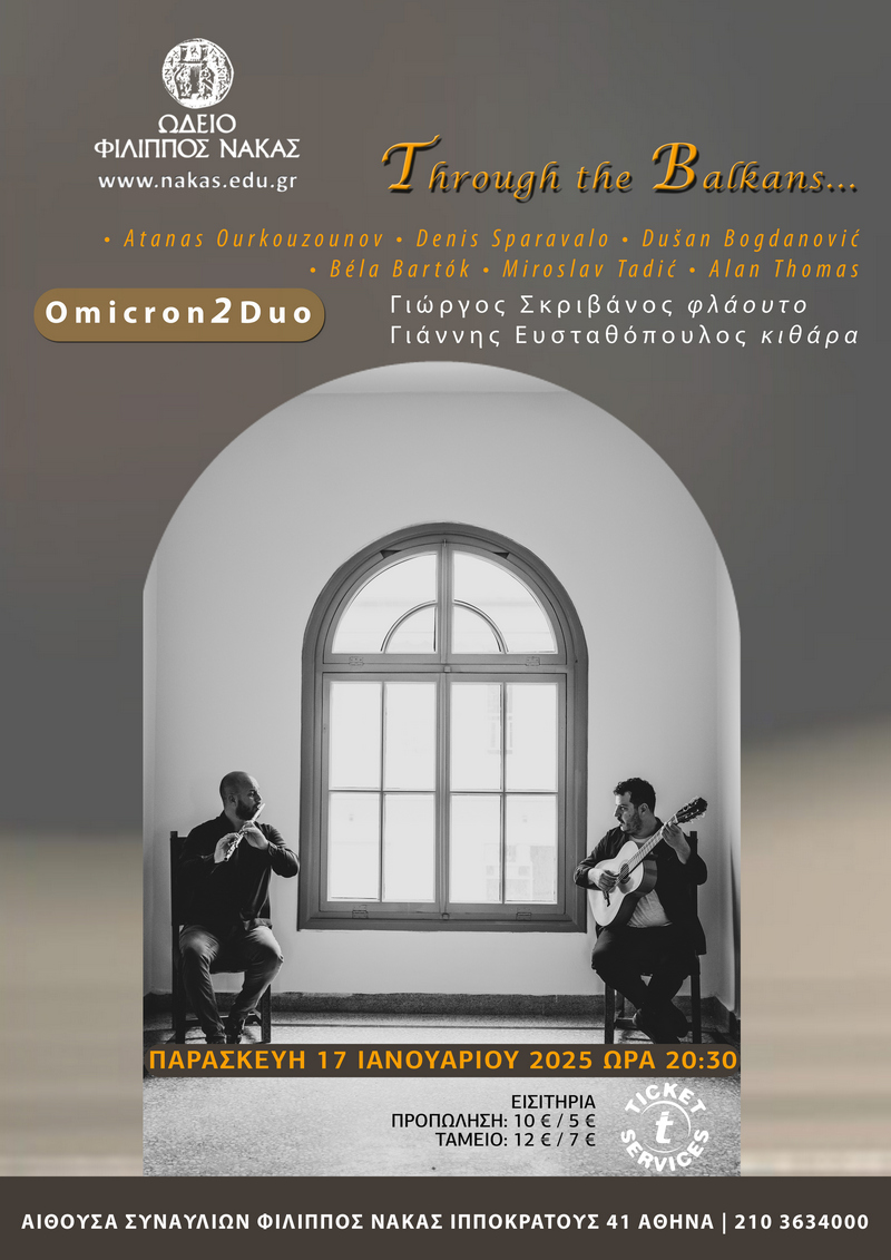 Ο φλαουτίστας Γιώργος Σκριβάνος και ο κιθαριστής Γιάννης Ευσταθόπουλος συγκροτούν το Οmicron2 Duo και στη συναυλία τους που θα δοθεί την Παρασκευή 17 Ιανουαρίου, ώρα 8.30 μ.μ. στην Αίθουσα Συναυλιών Φίλιππος Νάκας θα παρουσιάσουν έργα συνθετών οι οποίοι γράφουν θέματα και χορούς σε παραδοσιακό ύφος από χώρες των Βαλκανίων. Οι δύο μουσικοί θα αναδείξουν ένα πολυστυλιστικό τοπίο μέσα από τον κλασικό ήχο ενός φλάουτου και μιας κιθάρας. Οι απαιτητικοί ρυθμοί, οι τεχνικές κρουστών, οι διευρυμένες εναρμονίσεις της κιθάρας αντιπαραβάλλονται με τα εξωγενή ηχοχρώματα και τις σύγχρονες τεχνικές στο φλάουτο σκιαγραφώντας συχνά τα παραδοσιακά πνευστά όπως το νέυ ή το καβάλι.