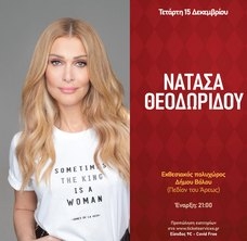 Στο πλαίσιο των εορταστικών εκδηλώσεων του Δήμου Βόλου και της Διεύθυνσης Πολιτισμού του Δ.Ο.Ε.Π.Α.Π. – ΔΗ.ΠΕ.ΘΕ. Δήμου Βόλου ξεχωρίζει η μεγάλη συναυλία με τη Νατάσα Θεοδωρίδου, που θα πραγματοποιηθεί στον Εκθεσιακό Πολυχώρο του Δήμου Βόλου στο Πεδίον του Άρεως. Την Τετάρτη 15 Δεκεμβρίου στις 21:00 η Νατάσσα Θεοδωρίδου θα ερμηνεύσει τις μεγάλες επιτυχίες της που έχουν γράψει ιστορία στην ελληνική δισκογραφία.