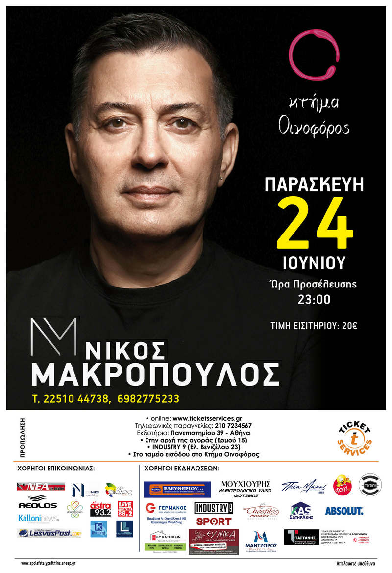 Ο αγαπημένος λαϊκός τραγουδιστής Νίκος Μακρόπουλος έρχεται στην Μυτιλήνη, για να μας χαρίσει μία μοναδική βραδιά κεφιού και διασκέδασης. Θα μας ετοιμάσει ένα ξεχωριστό πρόγραμμα, με τις μεγαλύτερες λαϊκές του επιτυχίες, που θα μας μείνει αξέχαστο.