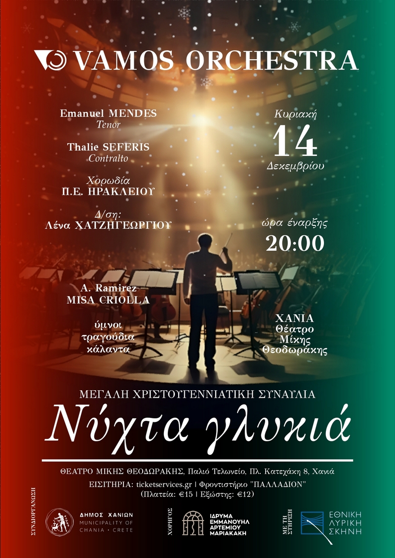 H Χριστουγεννιάτικη Συναυλία με "Νύχτα γλυκιά" της Ορχήστρας Vamos, με έργα κλασικών συνθετών, χριστουγεννιάτικες μελωδίες και κάλαντα, υπό τη διεύθυνση του Θανάση Παπαθανασίου, θα πραγματοποιηθεί στα Χανιά στο Θέατρο Μίκης Θεοδωράκης, την Κυριακή 14 Δεκεμβρίου 2025 και ώρα 20.00.